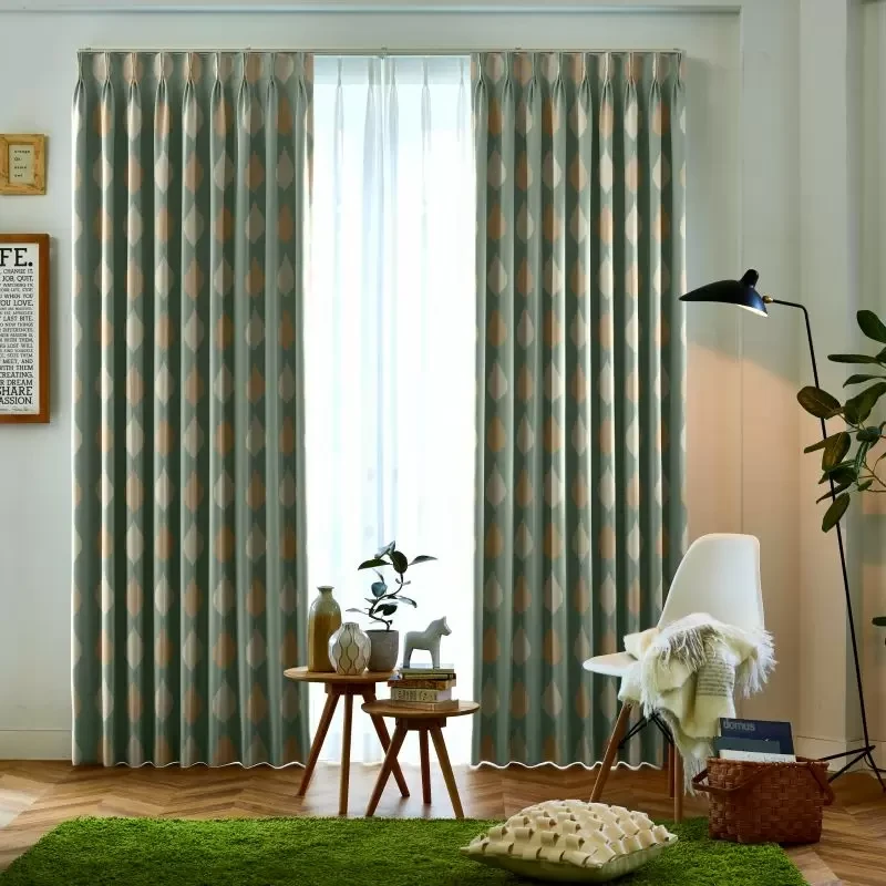 雨粒とお菓子のドロップをモチーフにした、キュートなデザインの遮光3級ドレープです。北欧インテリアにマッチする、ややグレイッシュなトーンで、子供部屋はもちろん、女性のお部屋やリビングと、幅広くお使い頂けます。モダン、ナチュラル、カジュアルテイストとミックスして、自分らしいスタイルに仕上げるのもおすすめです。家庭洗濯OK(ウォッシャブル)なので、お手入れも簡単。カラー:グレイッシュなグリーン色
