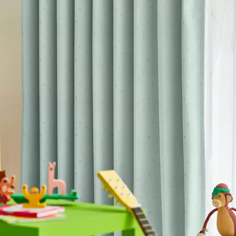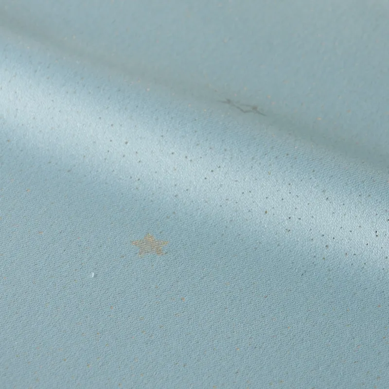なめらかな手触りの遮光生地に、フォイルプリント(箔転写)で夜空にキラキラと瞬く星や月のデザインを表現したドレープです。グラウンドにもグリッター状に細かな箔がちりばめられ、まるで天の川のように煌びやかです。星が金色になります。同シリーズのレース、トゥインクル・スター・シアーとのペアづかいがおすすめ。星は金色となります。